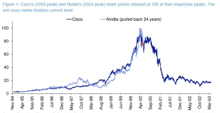 德银指出,英伟达的股价从6月份的峰值下跌了约25%,市值蒸发了8000多亿美元,目前正受到更多关注。德银《每日图表》(Chart of the Day)对英伟达和思科(CSCO.US)的股票进行了比较,因为英伟达是人工智能投资热潮中的领军企业,就像网络设备制造商思科是2000年科技泡沫的“典型代表”一样。