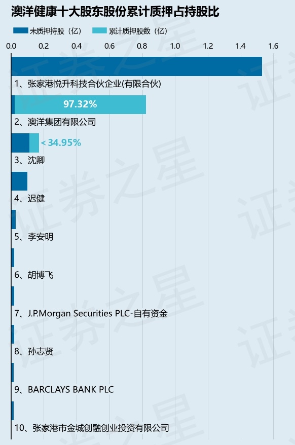 截止本公告日,股东澳洋集团有限公司已累计质押股份8000.0万股,占其持股总数的97.32%,股东沈卿已累计质押股份600.0万股,占其持股总数的34.95%。本次质押后澳洋健康十大股东的累计质押股份占持股比例(占持股比例的计算以公司最新一期财务报表公布的十大股东的持股总数为基准)见下图: